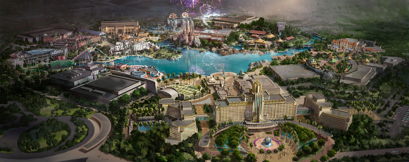 Working closely with Universal's Senior Management, Greg Damron produced the original overall resort master plan, the specific theme park master plan and design as well as the production, layout and design of the birds-eye view rendering seen here. Greg Damron teamed up with Aecom and continued work to produce the next phase overall resort master plan refinement, programming, and design. This image was the first document presented of the Universal Beijing Resort project.